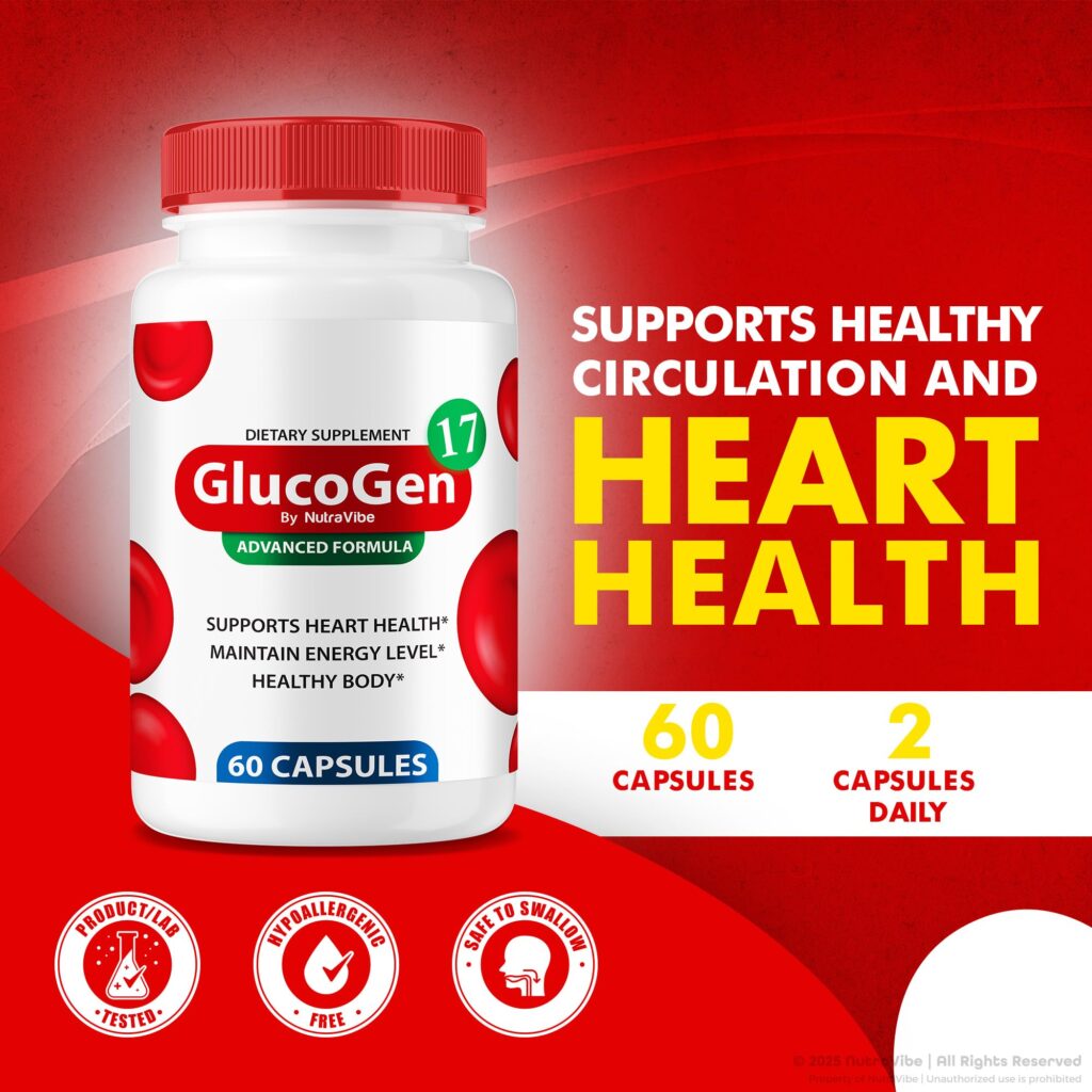 GlucoGen17 is a dietary supplement designed to support healthy blood sugar levels and metabolic balance. Its formula typically includes plant-based ingredients and nutrients commonly associated with glucose metabolism.